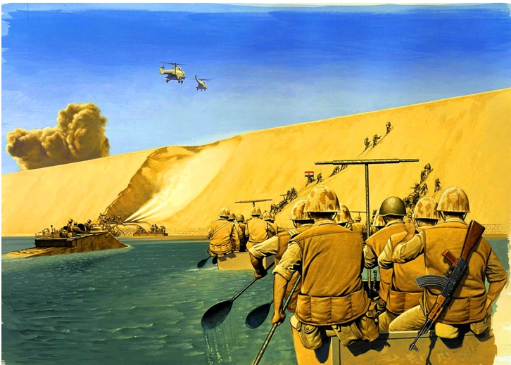 Topçu baraj ateşi altında 32.000 Mısır piyadesi beş geçiş noktası üzerinden Süveyş Kanalı’nı geçmeye başlar. İsrail hava kuvvetleri geçiş köprülerinin inşasında başarılı olamamış ve Mısır satıh-hava füzelerine karşı kayıplar vermiştir. Gün bitene kadar Mısır kuvvetleri Sina Çölünde 4-5 kilometre ilerlemiş ve 850 Mısır tankı Süveyş kanalını geçmeyi başarmıştır.