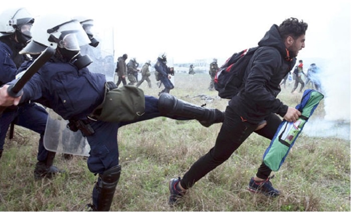 Selanik kenti batısındaki Diavata köyünde bulunan mülteci kampında protesto gösterilerine katıldığı için Yunan polisi tarafından tekmelenen bir sığınmacı. 06 Nisan 2019. Kaynak: AP.