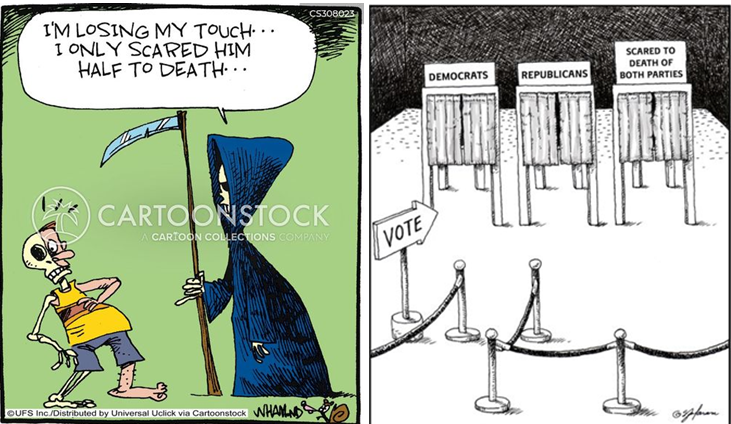 Solda Davw Whamond tarafından çizilen karikatürde ölüm meleği; ‘‘ESKİ YETENEKLERİMİ KAYBEDİYORUM, ONUN SADECE YARISINI ÖLECEK KADAR KORKUTTUM’’, Sağda Steve Zafarana tarafından çizilen bir karikatürde DEMOKRATLAR, CUMHURİYETÇİLER VE İKİ PARTİDEN DE ÖLESİYE KORKANLAR için hazırlanan oy sandıkları görülmektedir.