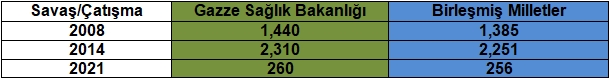 Gazze Sağlık Bakanlığı verileri her ne kadar halen sürmekte olan savaşta tam doğru olmasalar da, kayıpların genel sayısı hakkında güvenilir bir kaynaktır. Geçmişte yaşanan çatışmalarda; Sağlık Bakanlığı ile Birleşmiş Milletler (BM) kayıp sayılarını gösteren tablo aşağıdadır. Rakamlar görüldüğü gibi büyük oranda birbirini tutmaktadır.