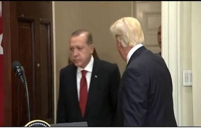 Son dönemlerde ABD-Türkiye arasındaki ilişkilerde yaşanan gerginliğin açık ve net bir fotoğrafı; Türkiye Cumhurbaşkanı Recep Tayyip Erdoğan, özel görüşme sonrası ABD Başkanı Donald Trump ile basın toplantısı öncesinde.