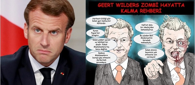 Solda Fransa’nın başındaki şaşırmış zat, sağda ise haddini bilmeme problemi yaşayan Hollanda milletvekili müsveddesi Geert Wilders ile ilgili bir karikatür.